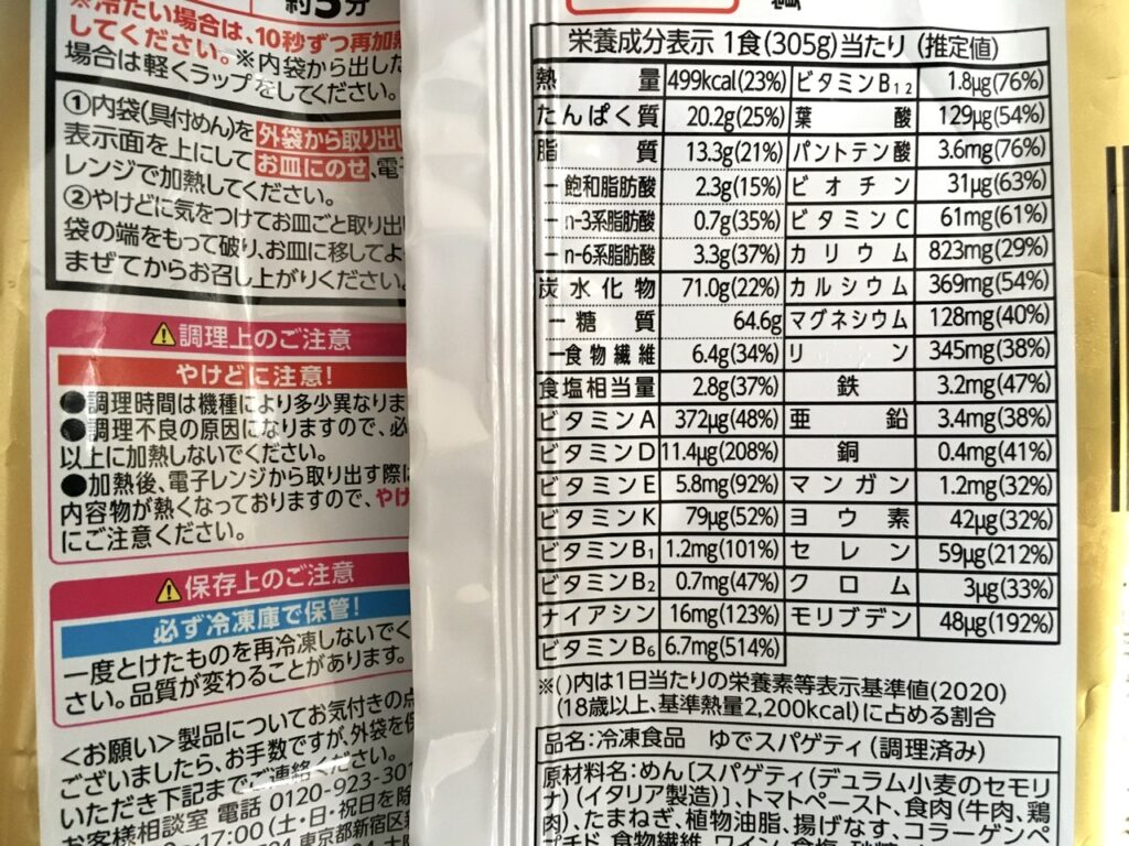 栄養成分はこちら。カロリーは500kcal弱で糖質64.6g。糖質オフというわけではないのですが、PFCバランス(摂取総カロリーに対するタンパク質、脂質、炭水化物の比率のバランス)は1食あたりで換算すると理想的な範囲にほぼ収まっています。
